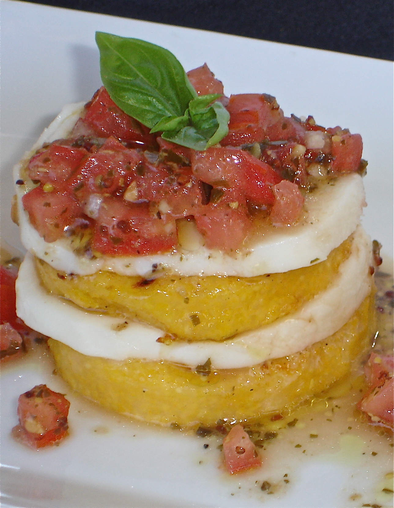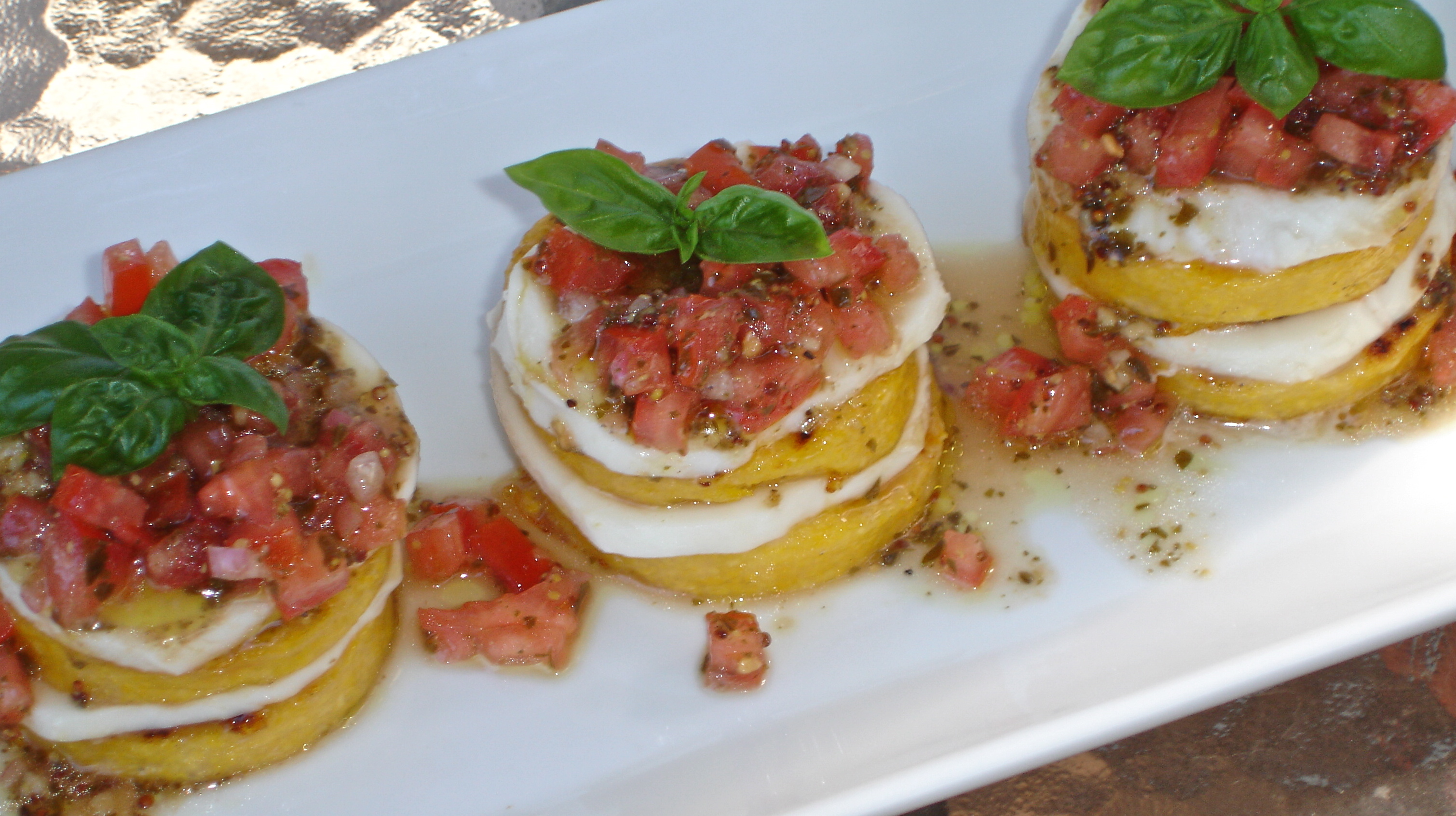 To serve, place one slice of mozzarella on top of one grilled polenta round; top that with one more polenta round, and finish by topping that with another mozzarella slice to create a layered tower. Dress the tower by drizzling a small spoonful of vinaigrette over the top, allowing it to flow down the sides. Garnish with tiny fresh basil leaves.