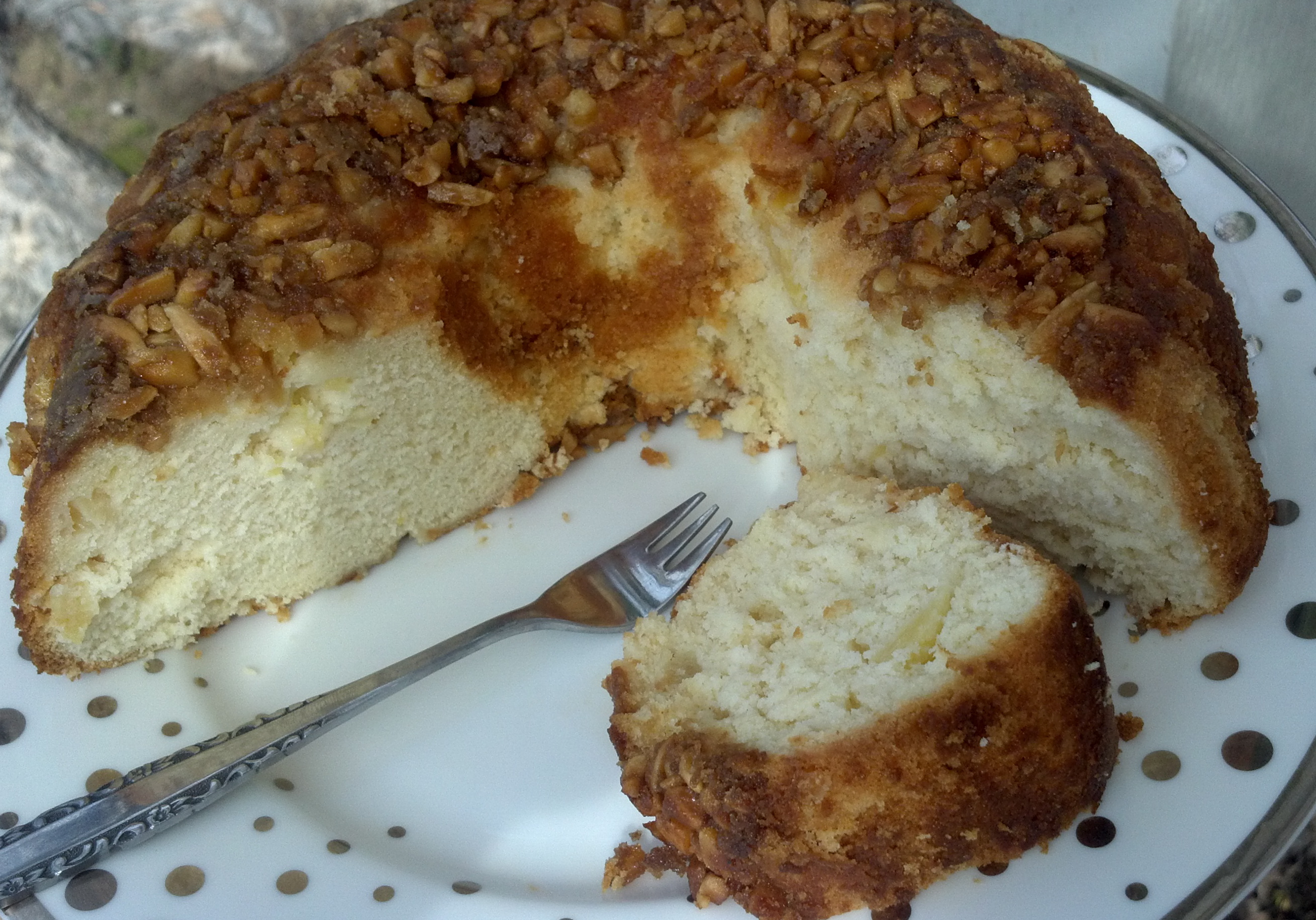 Bake for approximately 35 – 40 minutes. Remove from oven and allow to cool in pan for about 10 minutes. Before the cake has cooled completely and the topping has hardened to the bottom of the pan, gently ease the cake away from the sides of the pan using a butter knife. (You want to loosen the pan’s grip on the cake so that it will fall gently out of the pan when you invert it onto your serving plate.) Holding the plate securely over the bundt pan, covering the bottom of the cake, turn it upside down so the cake falls onto the plate. Remove the bundt pan to reveal (hopefully!) your glistening, sweet golden topping of carmelized pineapple tidbits and almonds. Replace any bald spots with topping that may still be in the bottom of the bundt pan. Let cool completely and serve at room temperature. This cake is even better the next day — especially with your morning coffee or tea. Refrigerate leftover cake — if you have any!